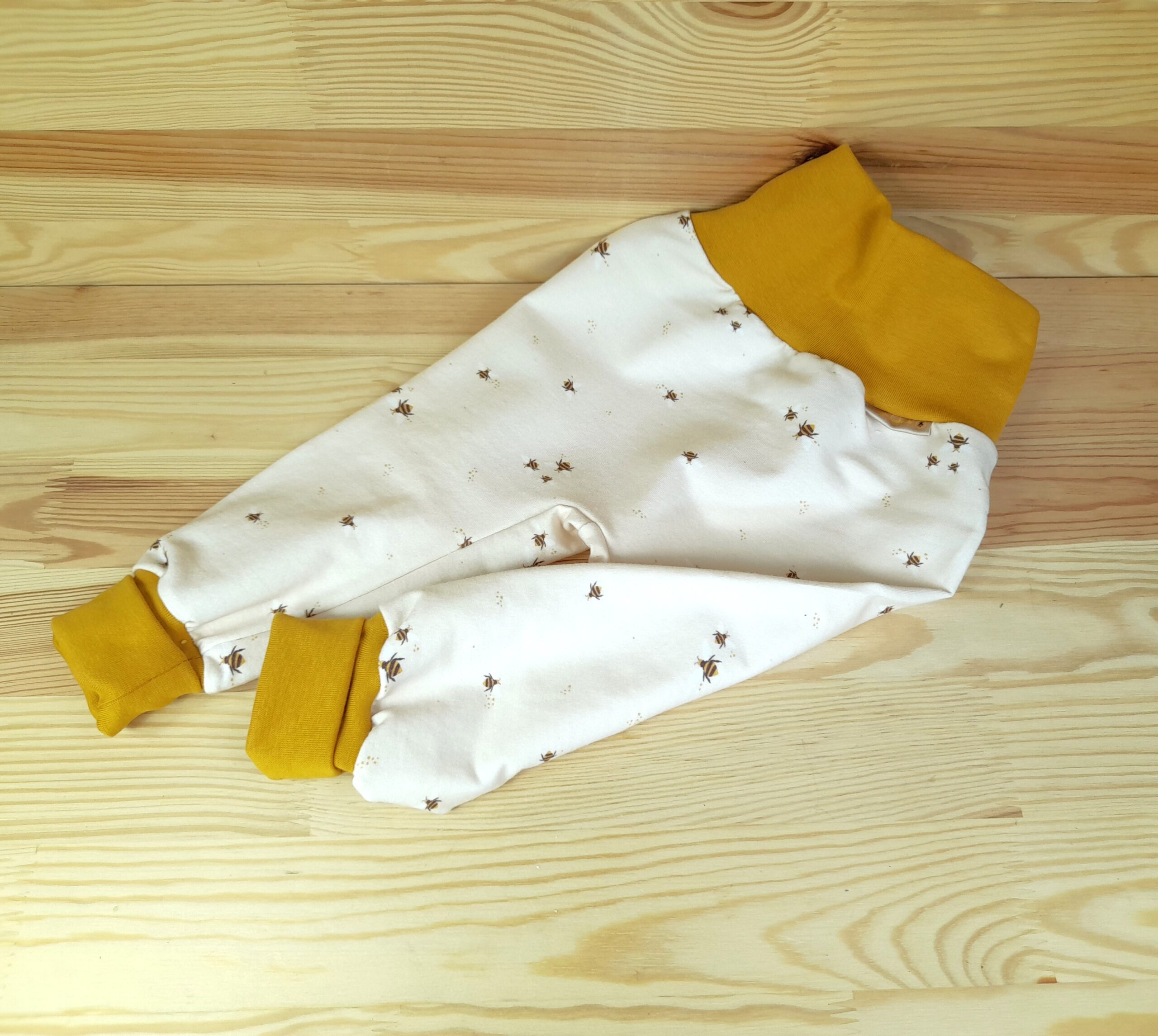 Herzige, bequeme mitwachsende Baby-Hose mit Bündchen aus Baumwolljersey mit Bienendruck weiss, Bündchen olivgrün